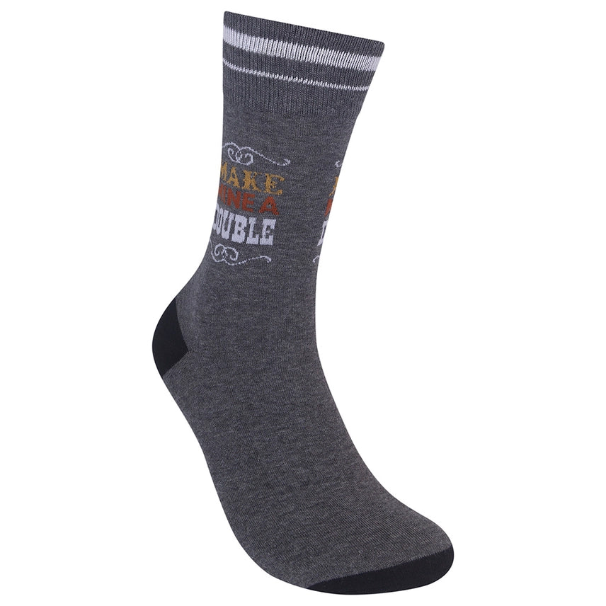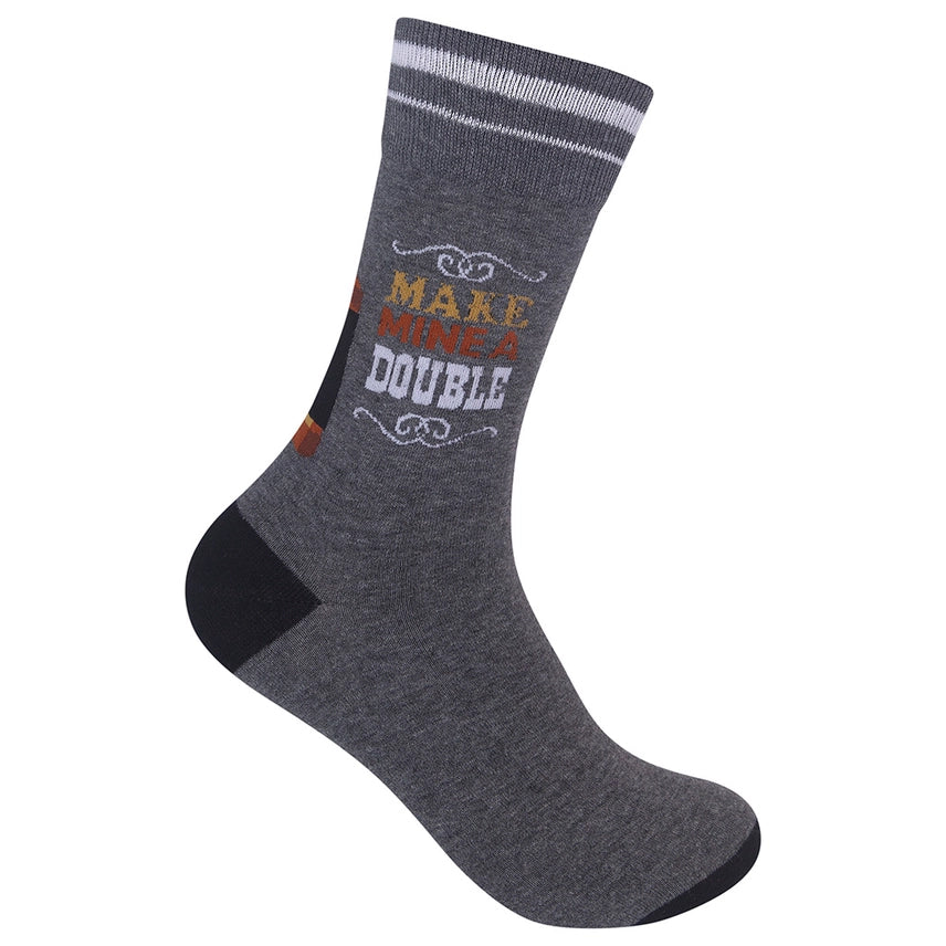 Double the fun with our "Make Mine A Double" socks! Whether you're a whiskey lover, cocktail enthusiast, or just appreciate a good whisky pun, these socks are sure to hit the spot. Featuring a playful design and crafted with premium materials for maximum comfort, these socks are perfect for adding a dash of humor to your outfit. Whether you're sipping on your favorite beverage or tackling your daily to-do list, these funny socks are the perfect accessory.